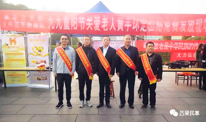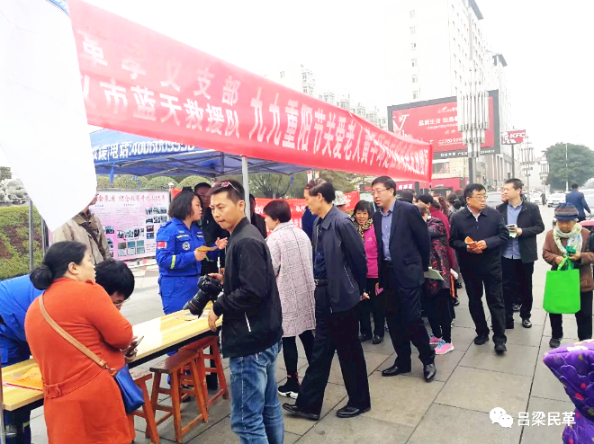 10月17日上午,民革孝义支部携手孝义蓝天救援队在孝义市政府广场举行了九九重阳节关爱老人黄手环定位贴免费发放公益活动。