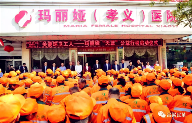 公益行动首站为孝义市1300名环卫工人赠送出每人价值1500元的玛丽娅(孝义)医院中医康复医疗救助基金卡及价值52000元的恒锋天蓝洗衣液。