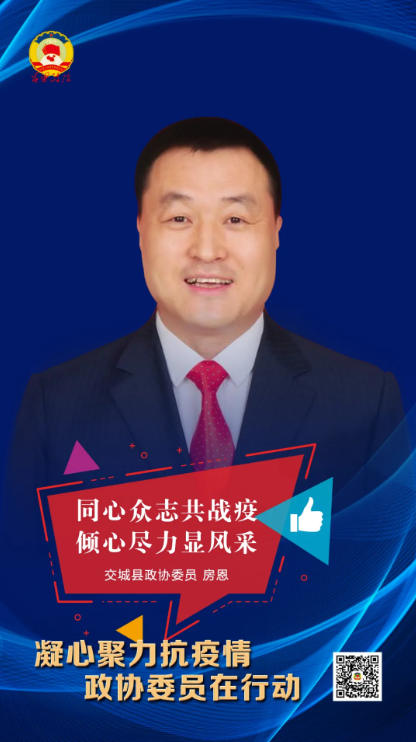 交城县政协委员房恩,响应县委号召和县政协倡议,捐资捐物一万余元,主动深入参与基层一线抗疫,积极参加各种形式的防控活动,为打赢这场没有硝烟的战争做出了应有的贡献。