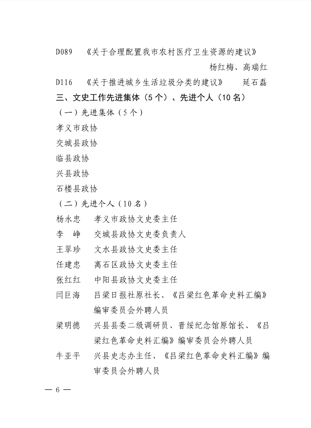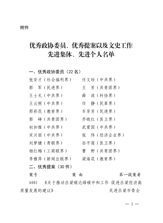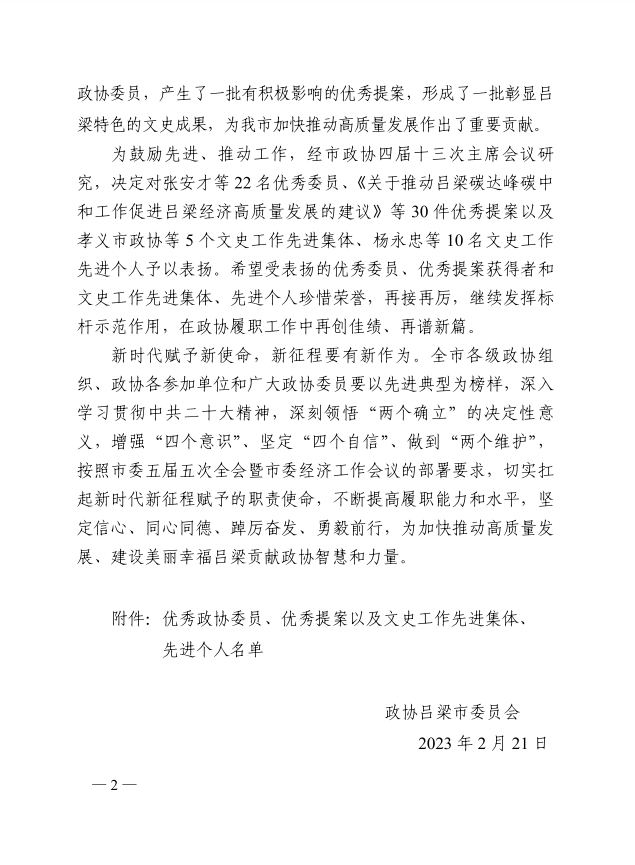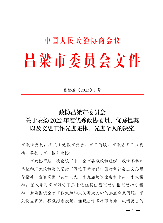政协吕梁市委会 关于表扬2022年度优秀政协委员、优秀提案以及文史工作先进集体、先进个人的决定